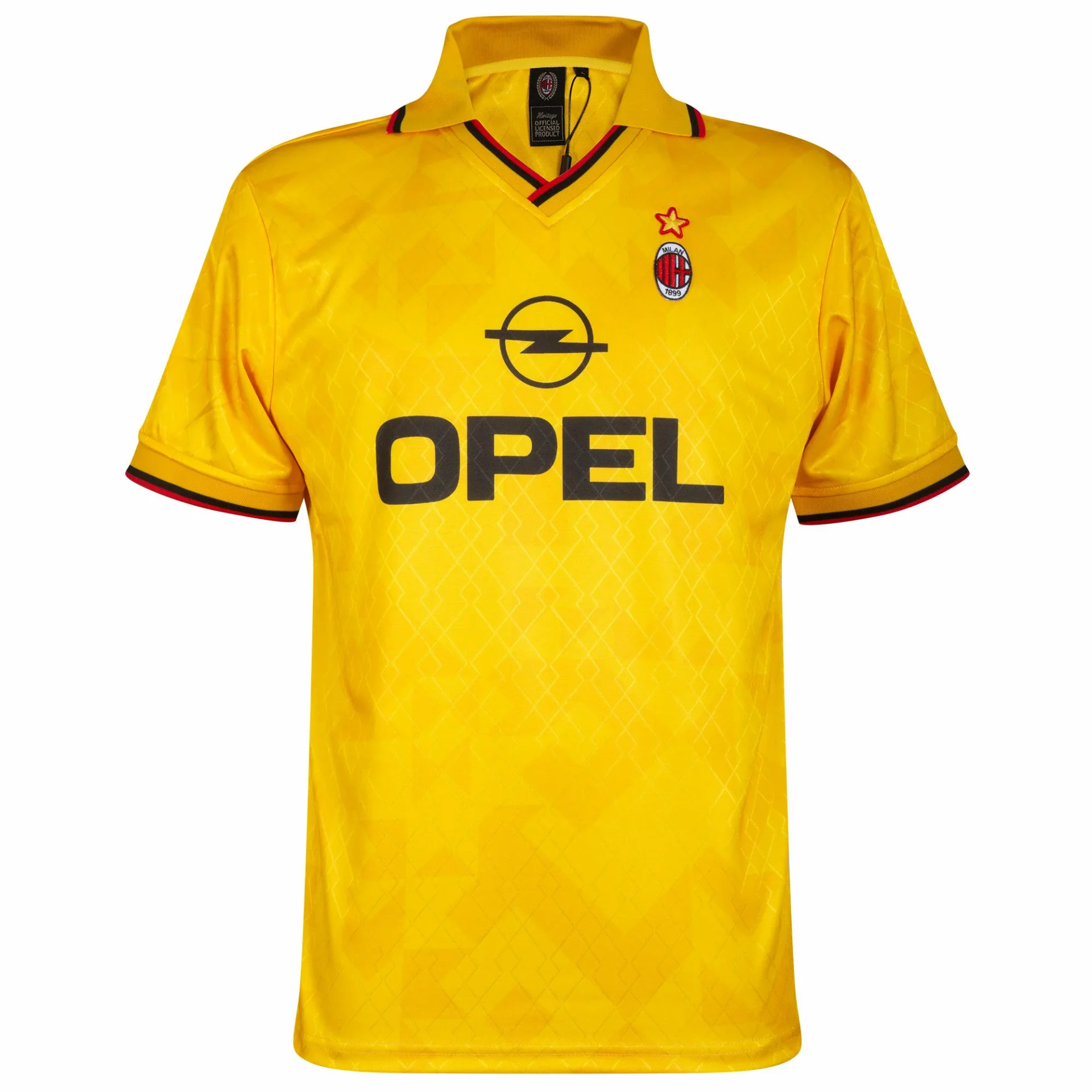 Dies ist das offizielle AC Mailand 3. Retro-Fußballtrikot 1995-1996. Dieses Retro-Fußballtrikot von Milan basiert auf dem dritten Fußballtrikot des AC Mailand aus der Saison 1995/96. Das Retro-Fußballtrikot ist überwiegend gelb. In der Mitte steht der Name des damaligen Sponsors OPEL. Auf der linken Brust befindet sich das Logo des AC Mailand mit einem goldenen Stern darüber. Darüber hinaus hat dieses Retro-Fußballtrikot des AC Mailand einen V-Ausschnitt und einen Polokragen mit einer rot-schwarzen Linie. Auch die Paspelierung enthält diese Farben. Schönes AC Mailand-Fußballtrikot für den echten Mailand-Fan! Das AC Milan Retro-Fußballtrikot von COPA Football hat eine normale Passform. Material: 100 % recyceltes Polyester.