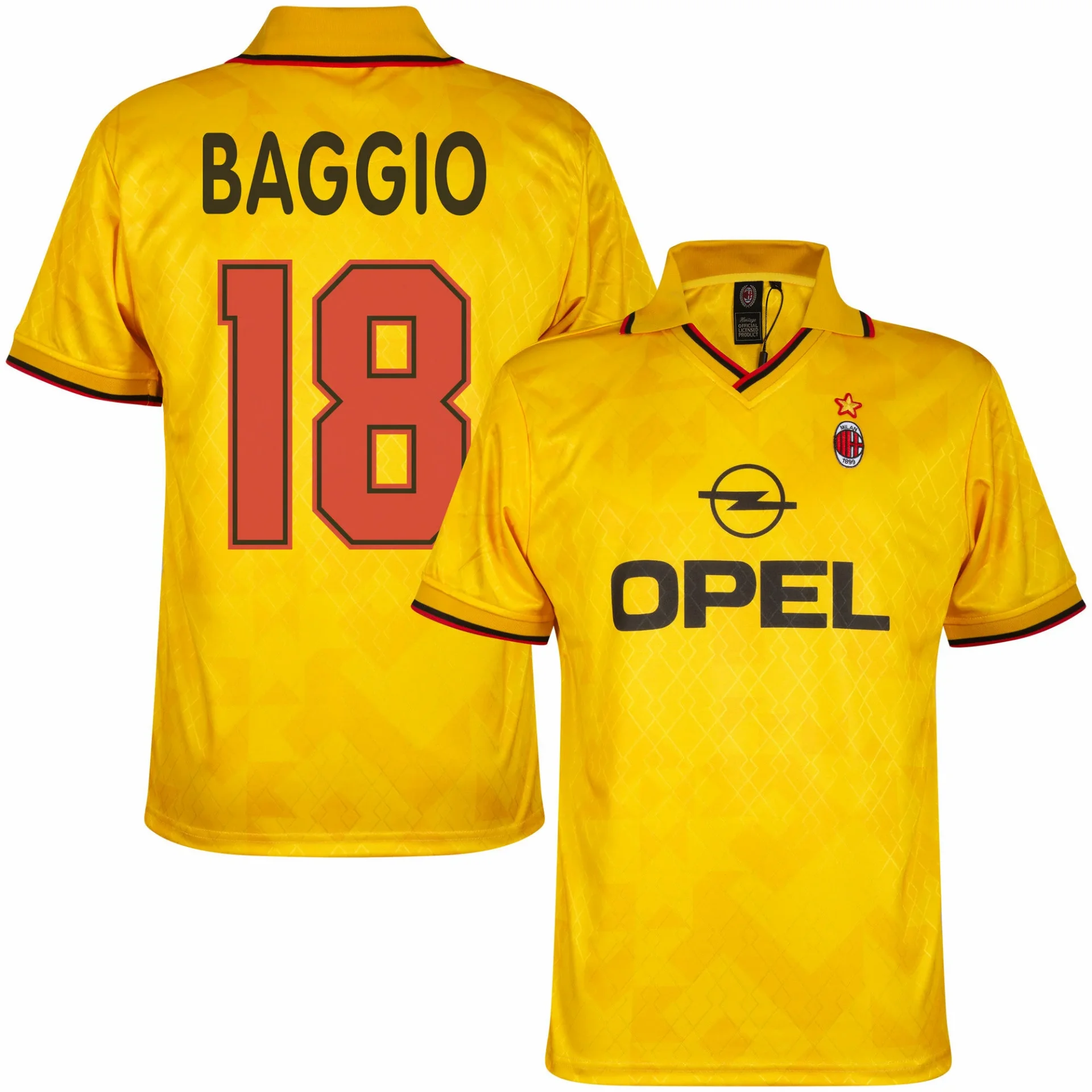 Dies ist das offizielle Ausweichtrikot des AC Mailand aus der Saison 1995/96. Auf dem Rücken prangt der Aufdruck „BAGGIO“ (18). Dieses Retro-Trikot basiert auf dem Ausweichtrikot des AC Mailand aus der Saison 1995/96. Es ist überwiegend gelb. Der Name des damaligen Sponsors Opel ist mittig aufgedruckt. Auf der linken Brust befindet sich das AC-Mailand-Logo mit einem goldenen Stern darüber. Das Trikot hat einen V-Ausschnitt und einen Polokragen mit rot-schwarzer Zierlinie. Auch die Paspelierung ist in diesen Farben gehalten. Ein fantastisches AC-Mailand-Trikot für jeden echten Milan-Fan! Das AC-Mailand-Retro-Trikot von COPA Football hat eine normale Passform. Material: 100 % recyceltes Polyester.