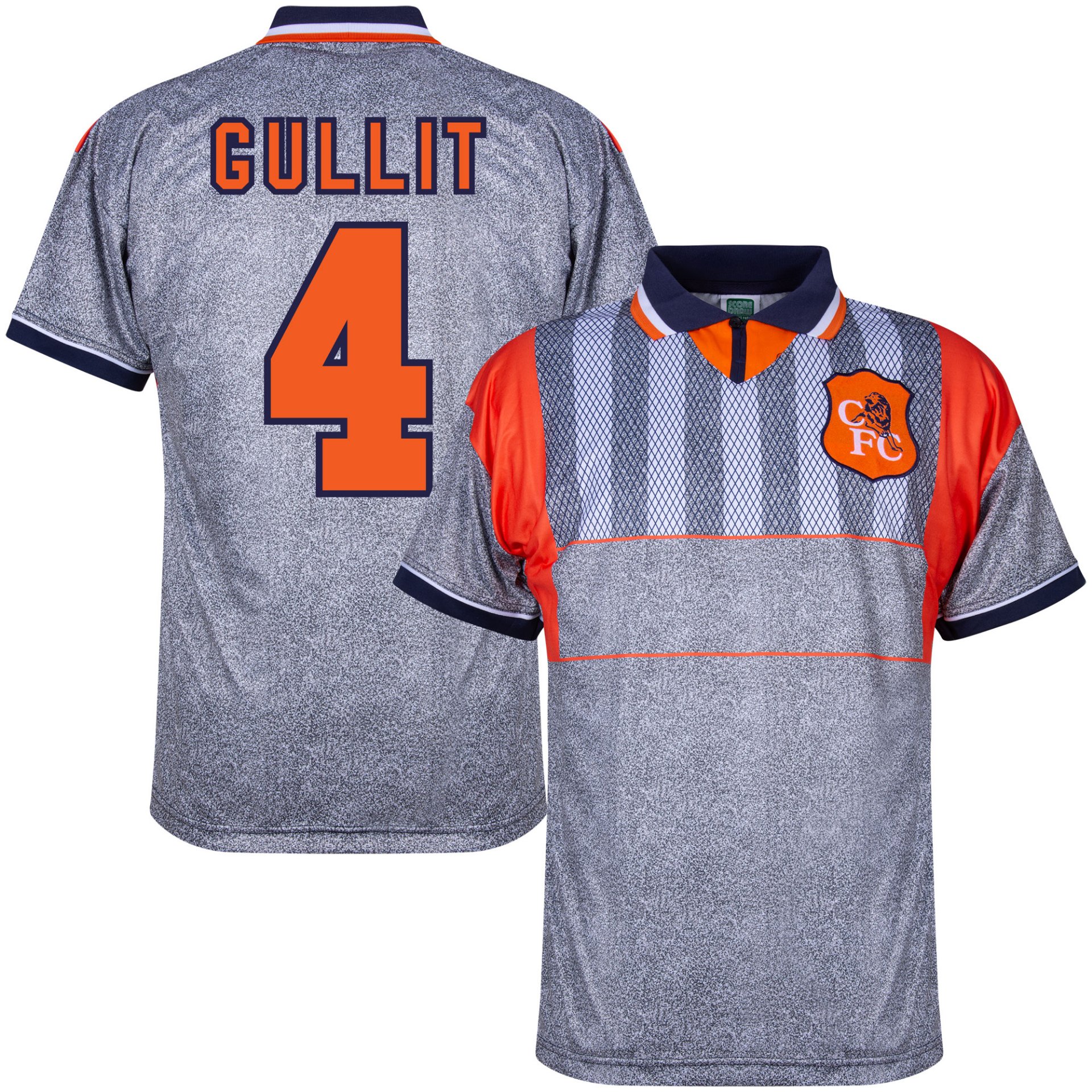 Das Chelsea Retro Trikot ist überwiegend grau und verfügt über auffällige orange und dunkelblaue Details. Beide Schultern sind mit orangefarbenen Flächen versehen, während die Brust ein markantes Rauten und Streifenmuster zeigt, das dem Trikot seinen einzigartigen Retro Look verleiht. Der dunkelblaue Polokragen mit weißem und orangem Streifen sorgt für einen klassischen Abschluss. Auf der linken Brust befindet sich das Chelsea Vereinswappen.
