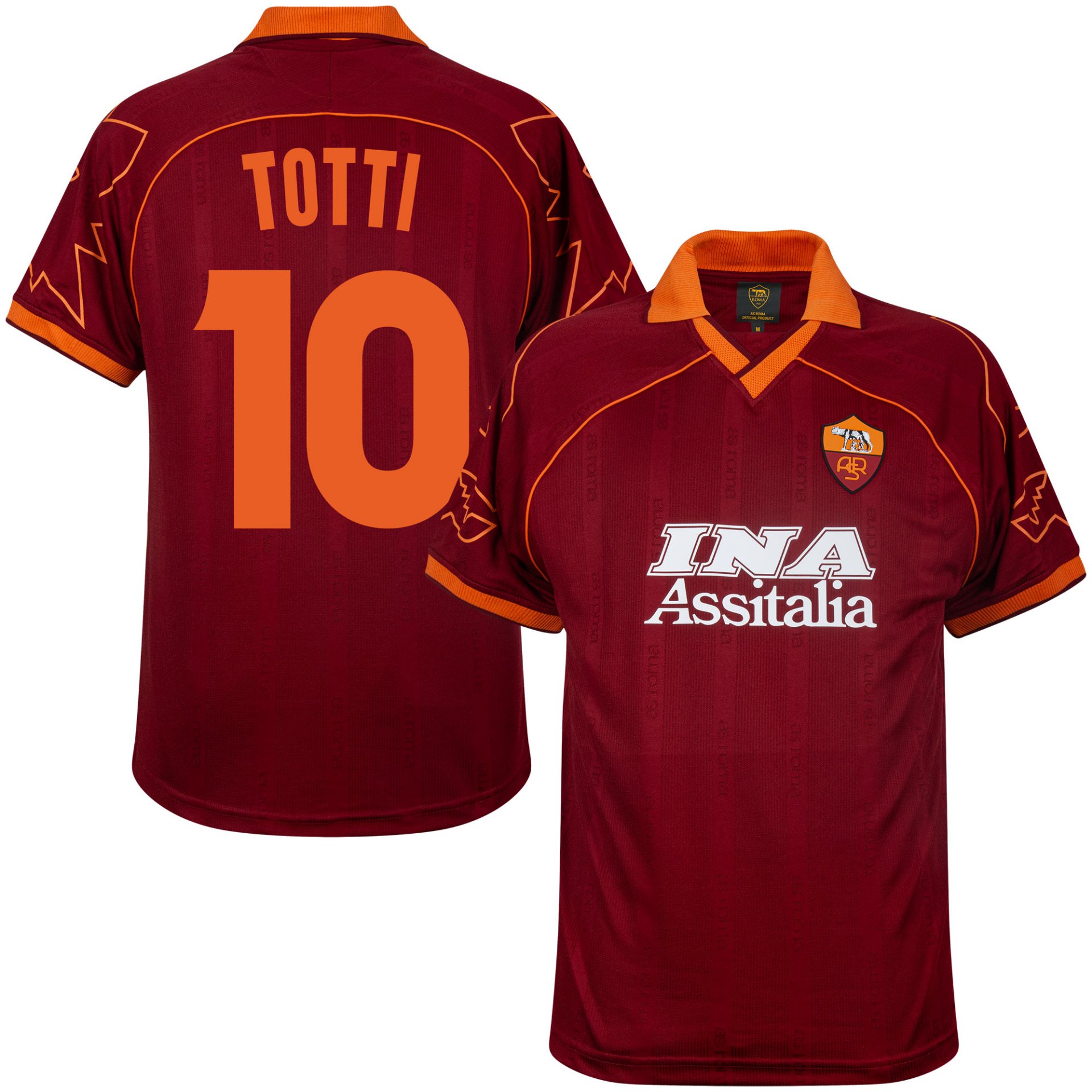 AS Roma Retro-Fußballtrikot 1999–2000 von COPA Football aus der offiziellen AS Roma Kollektion. Auf der Rückseite befindet sich der Aufdruck der AS Roma Legende TOTTI (10). Dieses AS Roma Retro-Trikot basiert auf dem Heimtrikot der AS Roma aus der Saison 1999/00. Das AS Roma Retro-Fußballtrikot hat kurze Ärmel und ist in der traditionellen dunkelroten Farbe gehalten. Charakteristisch für dieses Trikot ist der orangefarbene römische Wolf auf beiden Ärmeln. Der Polokragen und die Abschlüsse sind in Orange gehalten. In der Mitte der Brust befindet sich der Name des damaligen Sponsors, INA Assitalia. Auf der linken Brust ist das Logo des Fußballclubs aus Rom mit dem berühmten römischen Wolf abgebildet. Dieses AS Roma Fußballtrikot wurde von Spielern wie Montella, Totti, Delvecchio, Cafu, Aldair, Nakata und anderen Stars getragen.Material: 100 % Polyester.