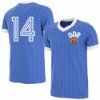 Dies ist das DDR-Fußballtrikot, das auf dem 1986 getragenen Trikot basiert. Das DDR-Retro-Trikot ist überwiegend blau und hat weiße Akzente. Das Shirt zeichnet sich durch die dünnen weißen Streifen aus. Darüber hinaus hat das Retro-Shirt kurze Ärmel und einen schönen V-Ausschnitt. Auf der linken Brust die Initialen DDR und das Wappen der DDR. Das Wappen der Deutschen Demokratischen Republik zeigte einen Hammer und einen Kompass, umgeben von einem Roggenring. Der Kragen und die Paspelierung sind in Weiß von diesem DDR-Fußballtrikot. Dieses COPA-Shirt wird in einer luxuriösen Geschenkbox geliefert. Material: 50% Baumwolle - 50% Polyester
