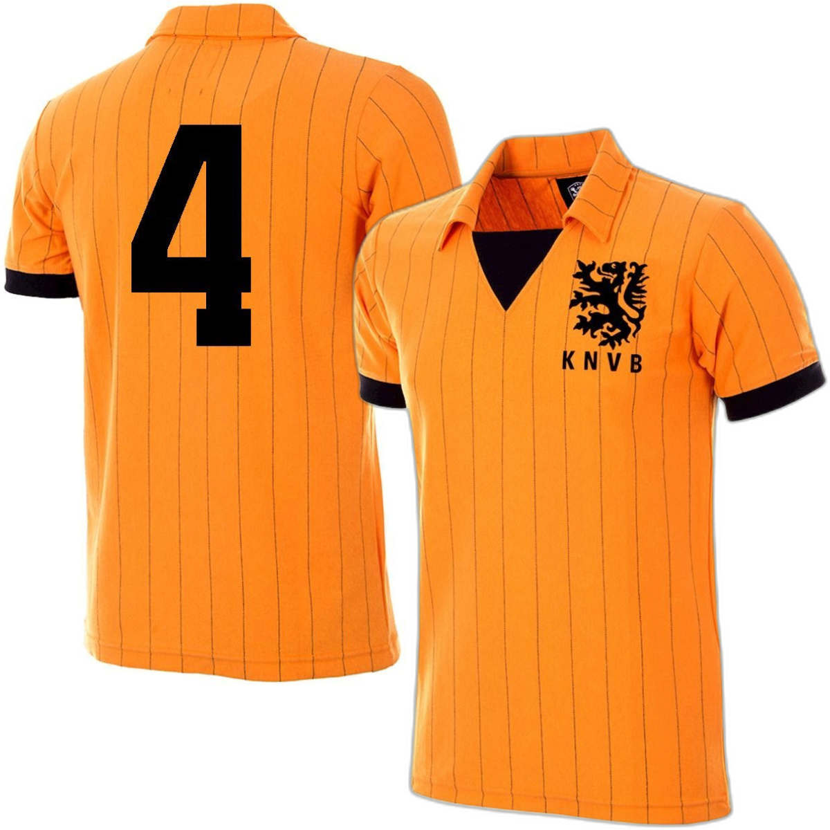 Retro Fußballtrikot der niederländischen Nationalmannschaft von COPA Football aus der offiziellen KNVB-Kollektion. Dieses Retro-Trikot basiert auf dem Fußballtrikot, das 1983 getragen wurde. Das Trikot hat die Nummer 4 auf der Rückseite. Dieses Holland-Retro-Trikot ist überwiegend orange und zeichnet sich durch dünne schwarze vertikale Linien aus. Das Retro-Shirt hat außerdem schwarze Paspeln und einen Polokragen. Der Hals hat eine quadratische schwarze Oberfläche. Auf der linken Brust befindet sich ein wunderschönes Holland-Emblem des berühmten Löwen mit den Initialen des Königlich Niederländischen Fußballverbandes (KNVB) darunter. Cooles Fußballtrikot der niederländischen Nationalmannschaft für den echten Oranje-Fan! Die Retro-Shirts von COPA haben eine normale Passform. Schönes Shirt zum Königstag, einer Europameisterschaft oder einer Fußball-Weltmeisterschaft.