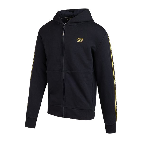 Sportliche Cruyff Sports Kapuzen-Trainingsjacke für Herren. Die Cruyff-Jacke ist komplett in Schwarz gehalten und hat eine Kapuze. Die Xicota Trainingsjacke von Cruyff zeichnet sich durch das goldene Taping an beiden Ärmeln aus. Das Klebeband trägt den Namen der Marke und das Cruyff-Logo. Auf der linken Brust befindet sich das Cruyff-Logo in Gold. Das Tape über den Ärmeln verleiht der Trainingsjacke einen sportlichen Look. Die Cruyff-Jacke aus der Cruyff Sports-Kollektion hat eine normale Passform. Material: 80 % Baumwolle – 20 % Polyester.