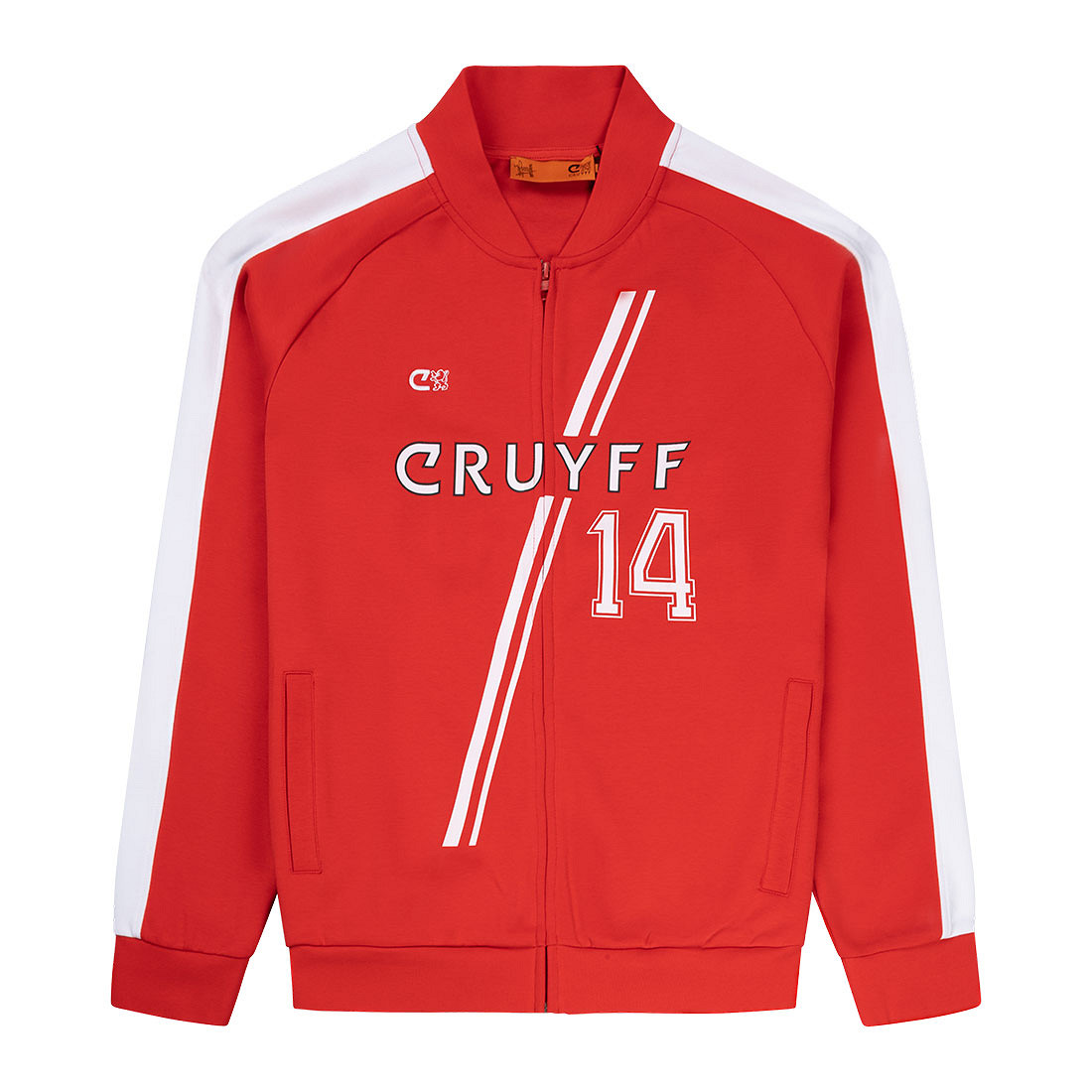 Das Design kombiniert eine kräftige rote Basis mit weißen Akzenten. Der Baseballkragen und die weißen Streifen entlang beider Ärmel verleihen der Jacke einen sportlichen und authentischen Retro-Look. Das bekannte Cruyff Logo befindet sich auf der rechten Brust, während der Schriftzug CRUYFF zentral platziert ist. Die zwei diagonalen weißen Streifen sorgen für ein markantes Design.