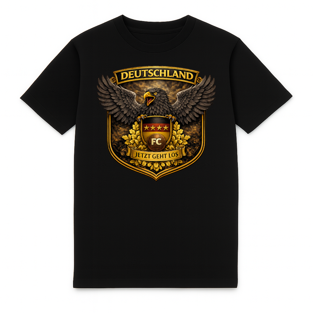 Dieses FC ELEVEN Deutschland Fußball-T-Shirt für Erwachsene ist ein echter Hingucker für jeden Fußballfan. Das Heavy-T-Shirt besteht aus schwerer Bio-Baumwolle und fühlt sich robust und angenehm an. Auf der Rückseite befindet sich ein auffälliger und farbenfroher Grafikprint von Deutschland, mit dem Adler aus dem deutschen Wappen im Mittelpunkt. Ergänzt wird der Print durch die Texte DEUTSCHLAND und Jetzt Geht Los, was dem Shirt eine kraftvolle und sportliche Ausstrahlung verleiht.
