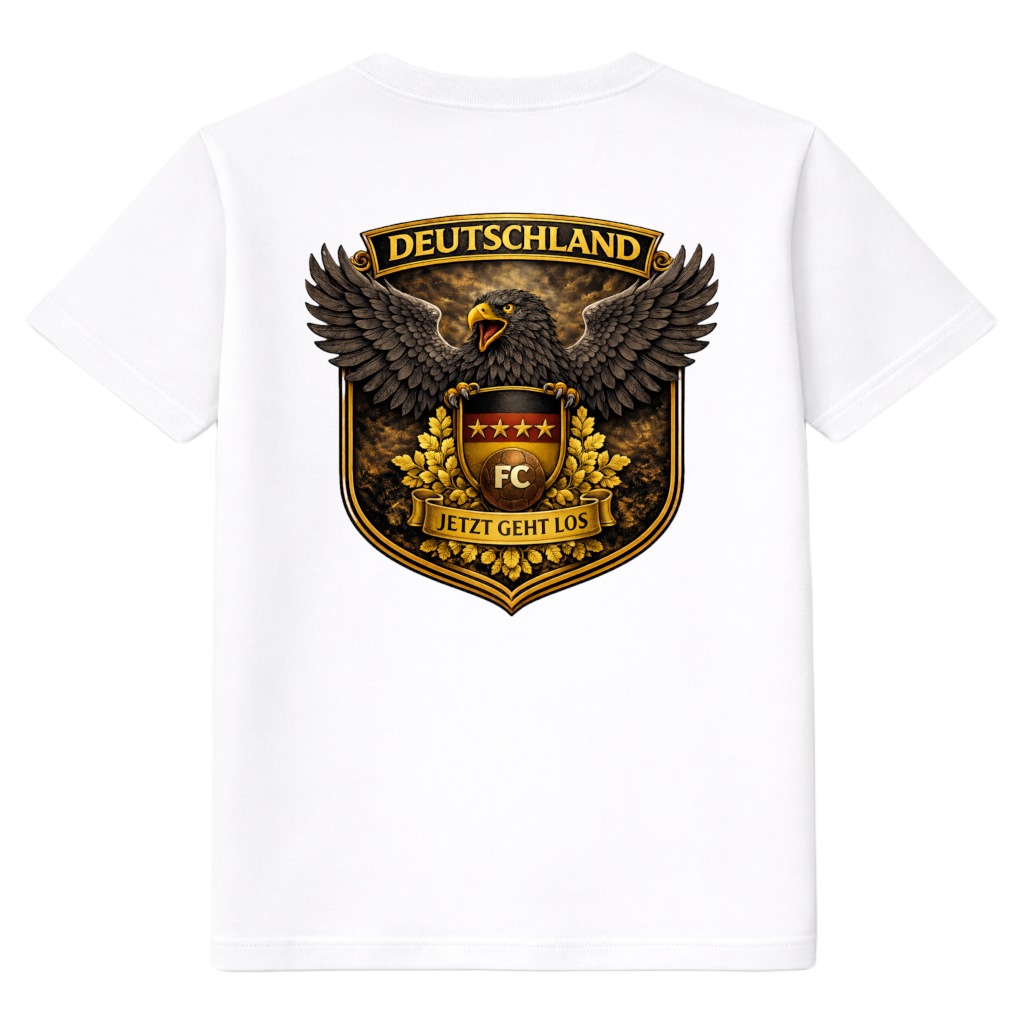 Dieses FC ELEVEN Deutschland Fußball-T-Shirt für Erwachsene ist ein echter Hingucker für jeden Fußballfan. Das Heavy-T-Shirt besteht aus schwerer Bio-Baumwolle und fühlt sich robust und angenehm an. Auf der Rückseite befindet sich ein auffälliger und farbenfroher Grafikprint von Deutschland, mit dem Adler aus dem deutschen Wappen im Mittelpunkt. Der Print wird durch die Texte DEUTSCHLAND und Jetzt Geht Los ergänzt, was dem Shirt eine kraftvolle und sportliche Ausstrahlung verleiht.