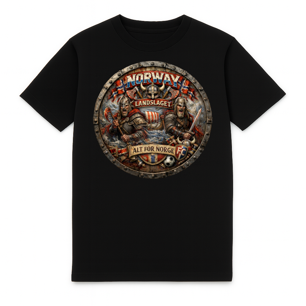 Stilvolles Norwegen Heavy T-Shirt für Erwachsene von FC ELEVEN. Dieses Heavy T-Shirt besteht aus schwerer Bio-Baumwolle. Die Rückseite des T-Shirts zeigt einen Print eines Schildes mit einem 3D-Druck norwegischer Wikinger und norwegischen Flaggen im Hintergrund. Der Print ist vollständig in den Nationalfarben Rot und Weiß gehalten. Außerdem enthält der Print die Texte Landslaget und Alt For Norge. Speziell zur Unterstützung der norwegischen Nationalmannschaft. Auf der linken Brust befinden sich die Initialen der Marke FC in Schwarz. Dies ist ein Silikonlogo. Das Heavy T-Shirt ist komplett schwarz und verfügt über einen Rundhalsausschnitt. Das T-Shirt ist aus schwerer Baumwolle gefertigt und hat eine normale Passform. Material: 100% Bio-Baumwolle.