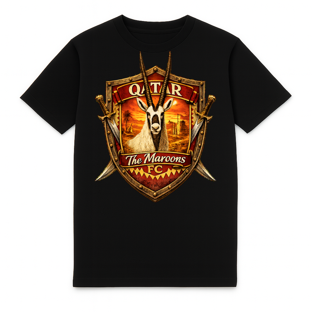 Stilvolles Qatar Heavy-T-Shirt von FC ELEVEN für Erwachsene. Das Heavy-T-Shirt besteht aus schwerer Bio-Baumwolle. Die Rückseite des T-Shirts zeigt einen Druck eines Schildes mit einem 3D-Druck eines Arabischen Oryx, dem Namen des Landes und dem Spitznamen der Nationalmannschaft: The Maroons! Außerdem enthält der Druck an den Seiten Schwerter. Auf der Vorderseite befindet sich auf der linken Brust das Markenlogo mit den Initialen FC in Schwarz. Dabei handelt es sich um ein Silikonlogo. Das Heavy-T-Shirt ist komplett schwarz und verfügt über einen Rundhalsausschnitt. Es besteht aus schwerer Baumwolle und hat eine normale Passform. Material: 100 % Bio-Baumwolle.