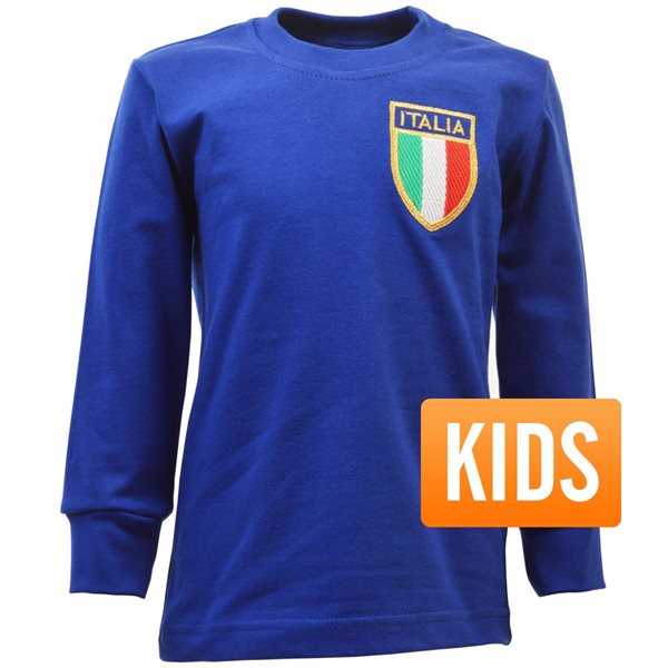 Italien Retro-Fußballtrikot für Kinder basierend auf dem Trikot der WM 1978. Blaues Retro-Trikot mit langen Ärmeln und Rundhalsausschnitt. Die Flagge Italiens auf der linken Brust. Schönes Italien Shirt für Kinder von TOFFS. Italien war viermal Weltmeister im Fußball (1934, 1938, 1982 und 2006). Bei der WM 1978 in Argentinien wurden die Italiener Vierter. Der Kampf um Platz 3 war zwischen Brasilien und Italien und die Brasilianer konnten mit 2:1 gewinnen.