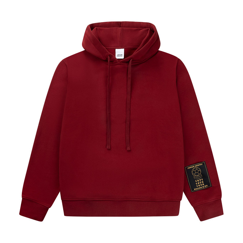 Stilvoller Johan Cruyff Premium Johan Hoodie in Dunkelrot für Erwachsene. Dieser hochwertige Hoodie besteht aus 100% schwerem French Terry und bietet eine lockere Passform für maximalen Tragekomfort. Der Ballon-d’Or-Patch am linken Ärmel verweist auf die Jahre 1971, 1973 und 1974, in denen Johan Cruyff diese prestigeträchtige Auszeichnung gewann. Ein dezentes Johan Cruyff Badge auf der Rückseite sorgt für eine exklusive Optik.