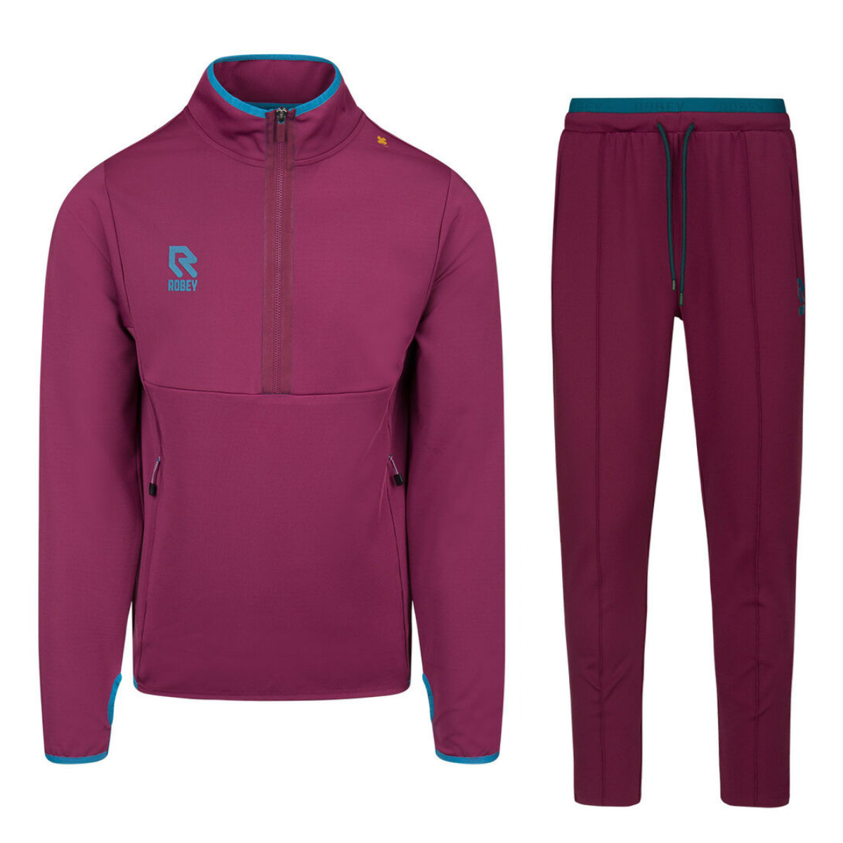 Sportlicher Off Pitch Scuba Trainingsanzug der Marke Robey. Der Anzug besteht aus einem dunkelroten Off Pitch Half-Zip Scuba Top und einer dunkelroten Off Pitch Scuba Trainingshose. Die Off Pitch Jacke und Hose sind perfekt zum Tragen nach und vor einem Training oder Wettkampf.