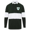 Irland Retro-Rugby-Shirt der Marke Rugby Vintage für Herren. Dieses irische Retro-Rugby-Shirt ist überwiegend grün und zeichnet sich durch den weißen horizontalen Streifen auf der Vorder- und Rückseite des Rugby-Shirts aus. Auch die Ärmel sind mit diesem breiten weißen Streifen versehen. Darüber hinaus verfügt das Irland-Retro-Shirt über einen klassischen weißen Polokragen. Auf der linken Brust befindet sich ein altes Abzeichen der Irish Rugby Union. Darüber hinaus ist dieses Retro-Rugby-Shirt unten mit seitlichen Schlitzen ausgestattet. Dieses irische Retro-Rugby-Shirt hat eine normale Passform. Perfekt für den wahren Fan der irischen Rugby-Mannschaft. Material: 100 % Baumwolle.